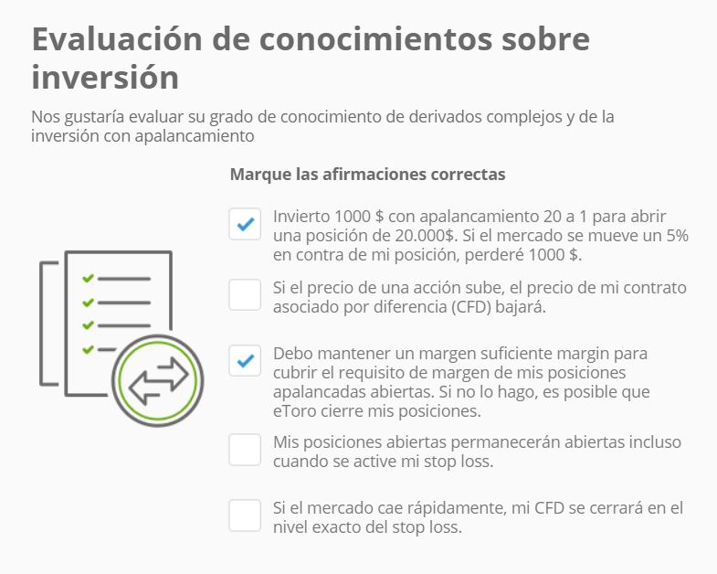Primero, muchas gracias por lo completo del artículo. Mi pregunta es la siguiente (corresponde al formulario de experiencia y objetivos de etoro). Resulta que de un momento a otro me quitaron la opción de invertir en CFD en la plataforma, siendo que llevo casi un año usándola y 3500 usd invertidos aproximadamente. Desde servicio al cliente me dicen que me bloquearon debido a mis respuestas en ese apartado (lo cual es raro porque nunca hice ninguna modificación desde que abrí mi cuenta). Te agradecería el feedback para saber si estoy haciendo algo mal.